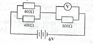 The resistance of the voltmeter in the circuit diagram illustrated above is 800\(\Omega\), Calculate the voltmeter reading.
