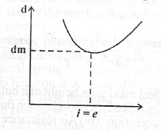 (iii) Sketch a graph to illustrate the variation of the angle of deviation d, with that of incidence, i, for a ray of light travelling from air into a triangular glass prism. Indicate on the graph the point at which the angle of incidence equal to the angle of emergence e.