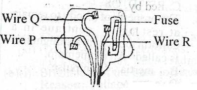 The diagram above illustrates the wire connections to a three-pin plug. The wires P, Q and R respectively are: