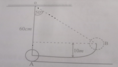 b. The diagram above illustrates an oscillatory pendulum. Calculate the work done in raising the pendulum to point B, if the mass of the bob is 50 g.