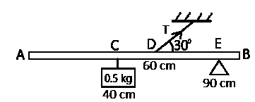 A block of mass 0.5 kg is suspended at the 40 cm mark of a light metre rule AB that is pivoted at point E, the 90 cm mark, and is kept at equilibrium by a string attached at point D, the 60 cm mark, as shown in the figure above. Find the tension T in the string.