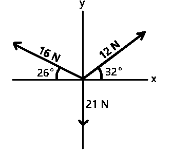 Three forces with magnitudes 16 N, 12 N and 21 N are shown in the diagram below. Determine the magnitude of their resultant force and angle with the x-axis
