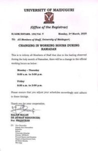 This is to inform all members of staff that due to the fasting observed during the holy month of Ramadan, there will be change in the official working hours as below;